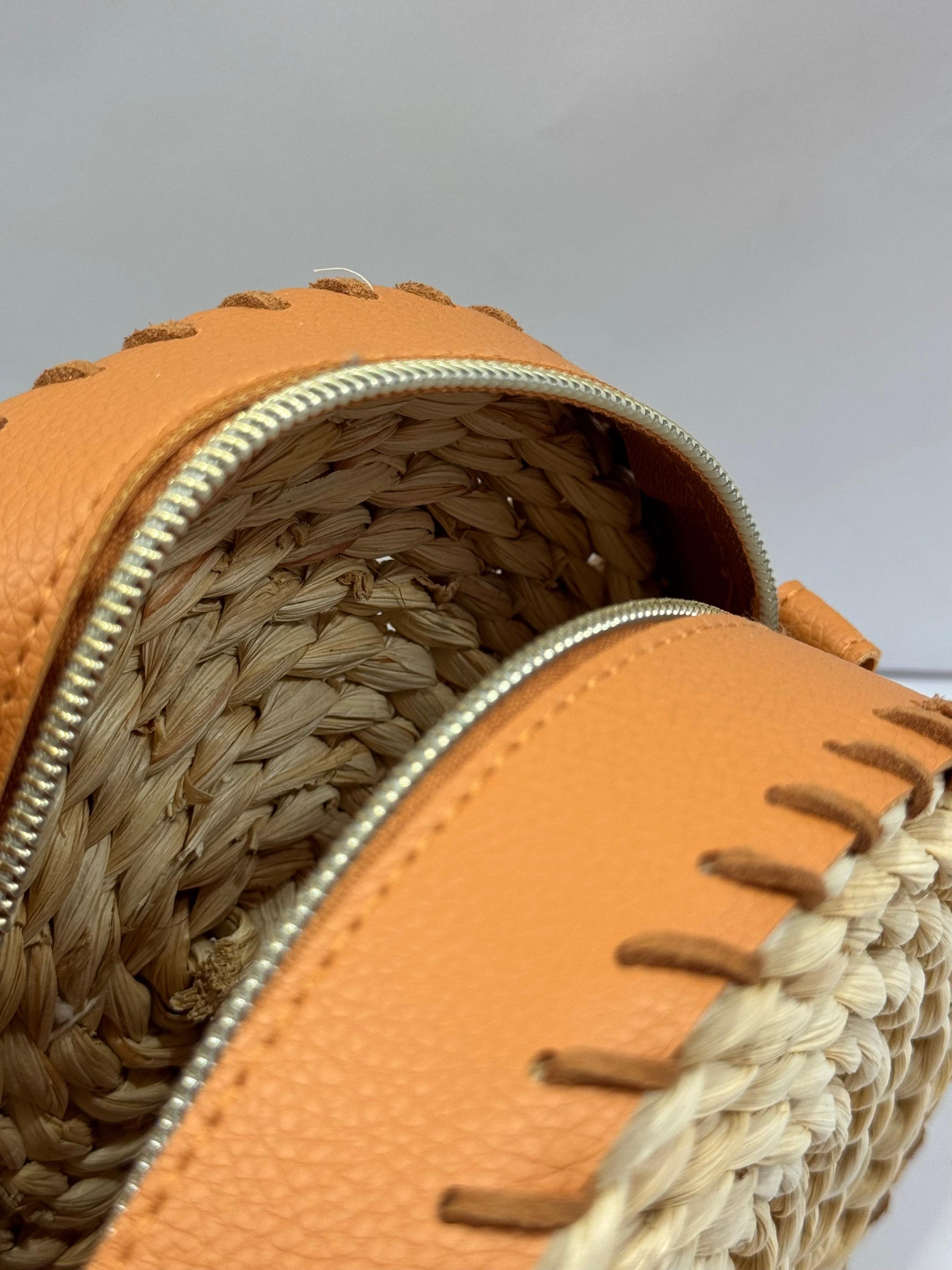 A boho-style straw crossbody designed in a compact round silhouette. Lightweight and versatile, it can also double as a cosmetic bag. Best suited for summer outings, vacations, and casual daily wear.
