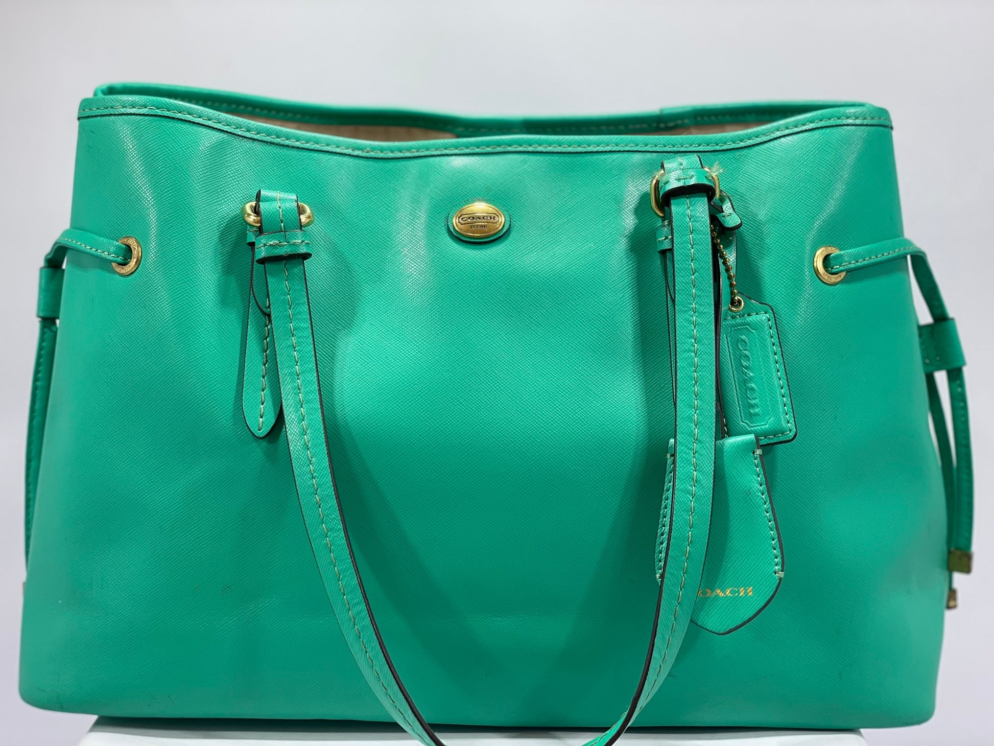 A polished and modern tote in saffiano leather with drawstring-adjustable sides. Its spacious interior, combined with gold-tone hardware and a structured silhouette, makes it an excellent choice for professionals or everyday use. The teal green finish offers a fresh pop of color.