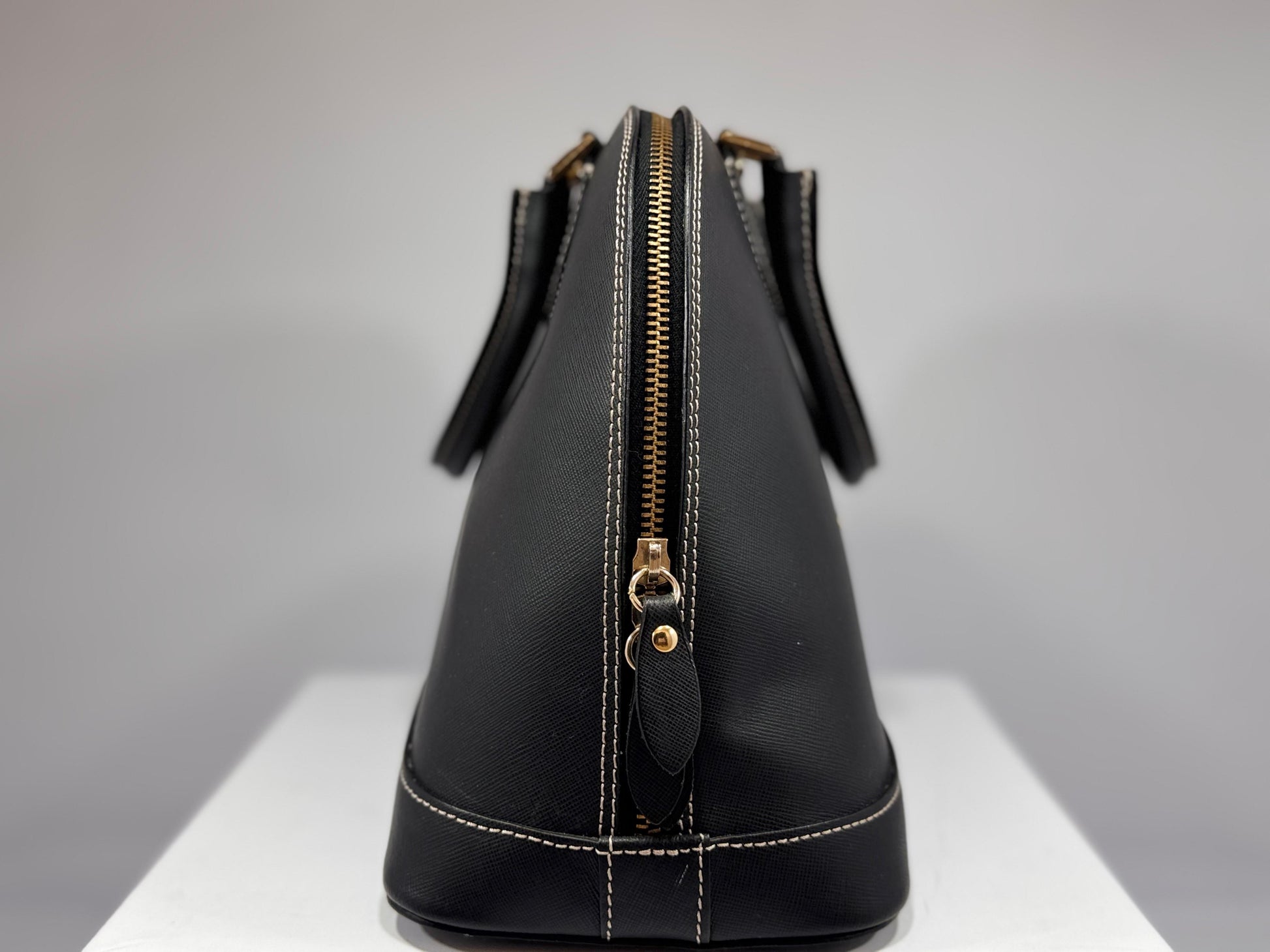 A structured black leather handbag with secure top zip closure and twin pullers. Includes a fully lined interior with an inner zip pocket and shoulder strap. Versatile for both professional and casual use.