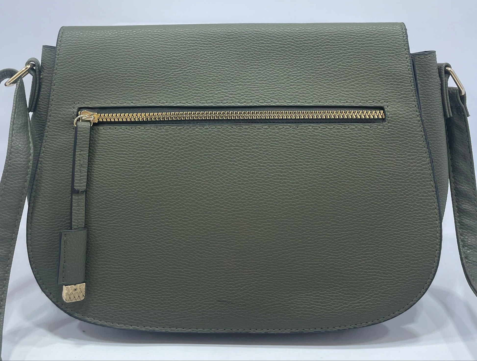 A casual faux leather handbag in olive green with gold hardware. Features outer zip pocket, magnetic closure, and spacious main compartment with organizational pockets. A practical option for daily wear.